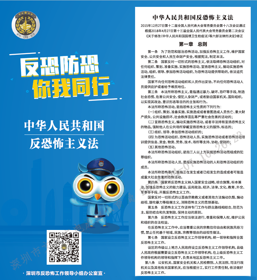 “反恐防恐 你我同行”中华人民共和国反恐怖主义法海报宣传(来源:深圳市反恐怖工作领导小组办公室宣)